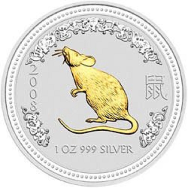 Позолоченное изображение крысы — символа 2008 года по Лунному календарю. Справа от крысы изображен иероглиф, обозначающий крысу. Слева — год, символом которого является крыса. Снизу вес и чистота металла.