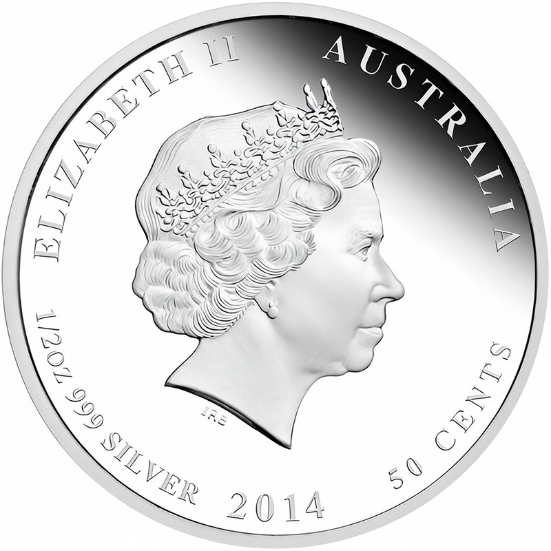 На аверсе изображен профиль королевы Елизаветы II дизайнера Яна-Рэнка Бродли. Вверху надпись ELIZABETH II AUSTRALIA (Елизавета II, страна-эмитент). Внизу по ободу указан год чеканки (2014), номинал монеты (50 CENTS), вес (1/2 oz) и проба серебра в монете (999 SILVER).