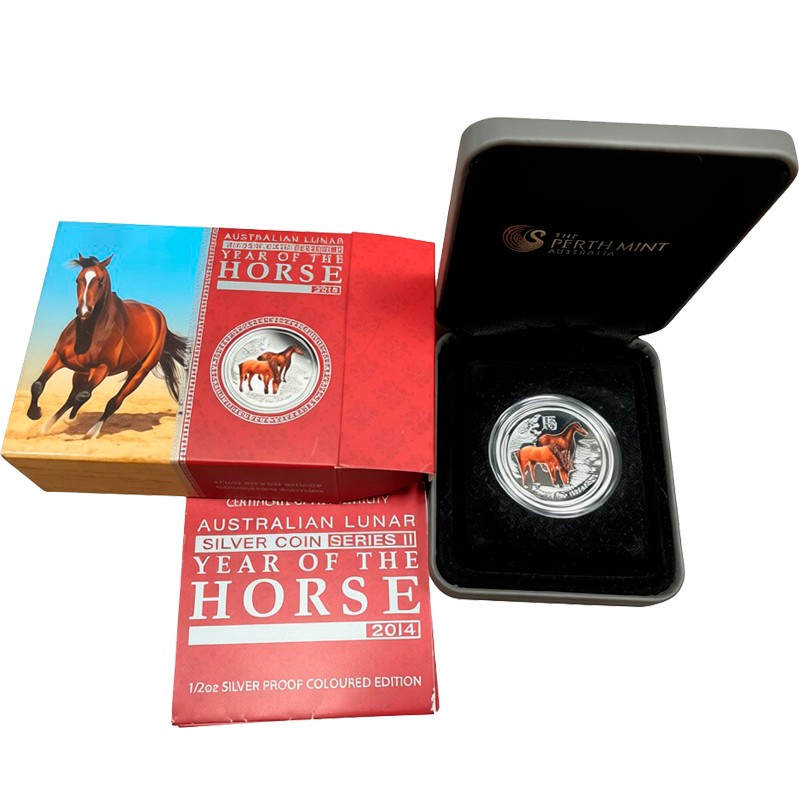 Серебряная монета из серии «Лунар II» от Пертского монетного двора Австралии весом в пол унции посвящена символу 2014 года – Лошади.