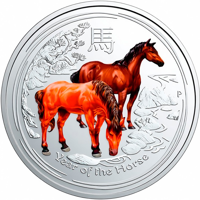 На реверсе изображены две лошади в цвете, стоящие на фоне стилизованного китайского пейзажа. Вверху китайский иероглиф 馬(лошадь), справа: P – монограмма Пертского монетного двора, ниже: ТV (Tom Vaughan) – инициалы дизайнера. Внизу вдоль канта: Year of the Horse.