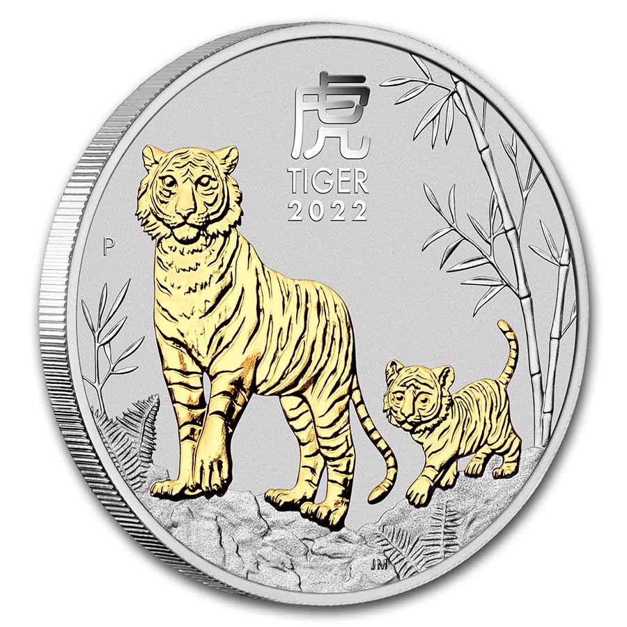 Изображение тигрицы с тигренком, покрытые 24-каратным золотом, среди папоротника и бамбука. Вверху китайский иероглиф, обозначающий «ТИГР», английское слово — TIGER( тигр) и год — 2022