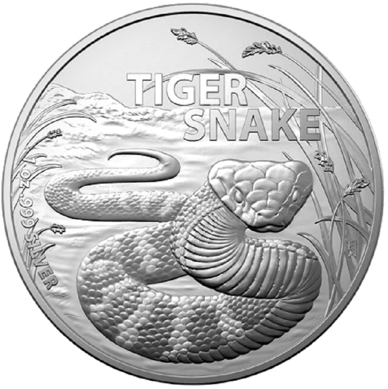 На реверсе изображена тигровая змея, скользящая по траве. Надпись: TIGER SNAKE; по ободу вес и чистота металла: 1 oz .999 SILVER
