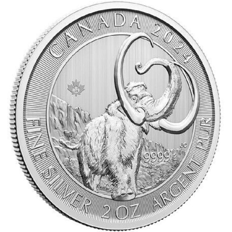 изображен гигант ледникового периода — Шерстистый мамонт. Его легко узнать по длинным изогнутым бивням, которые являются одними из самых характерных окаменелостей ледникового периода Канады. Эта монета имеет два передовых элемента защиты: точные радиальные линии и кленовый лист с микрогравировкой, обработанный лазером, и цифрой «24» (видимой при увеличении), обозначающей год выпуска монеты. Надписи включают CANADA, 2024, 9999, FINE SILVER и 2 OZ ARGENT PUR.