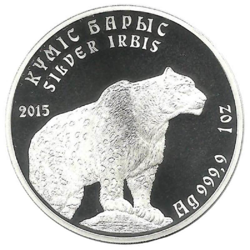 На оборотной стороне (реверсе) монет в центральной части изображение снежного барса. Слева от изображения число «2010» обозначающее год чеканки. В верхнем секторе по окружности в две строки надпись «КҮМІС БАРЫС» на государственном языке и «SILVER IRBIS» на английском языке, в правом - по окружности надпись («Ag 999,9 1oz» обозначающая металл, из которого изготовлена монета, его пробу и массу соответствующей монеты в унциях. По окружности выступающий кант.