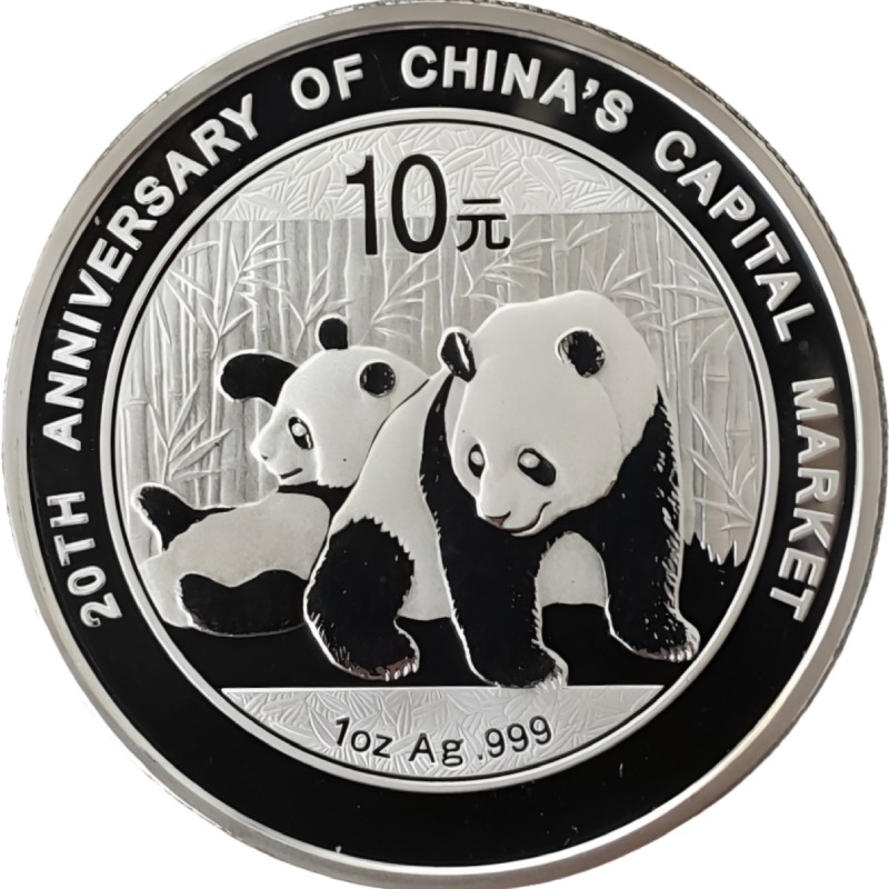 Серебряная инвестиционная монета Китая, выпущенная в честь 20-летия рынка капитала.