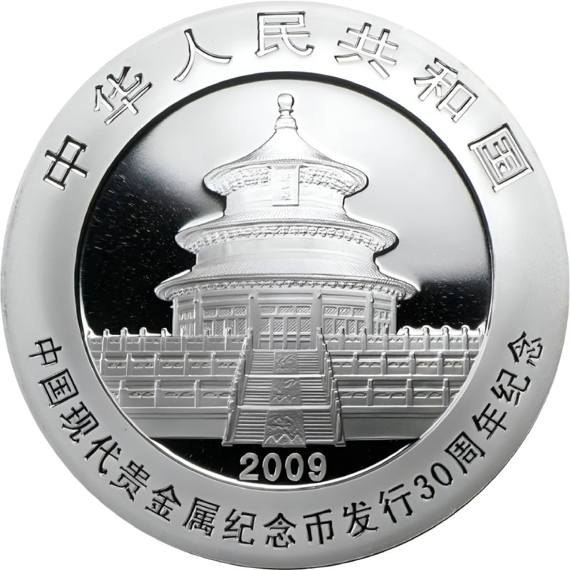 Серебряная монета Китая "Панда. 30-летие выпуска памятных монет" 2009 г.в., 31.1 г чистого серебра (проба 999)