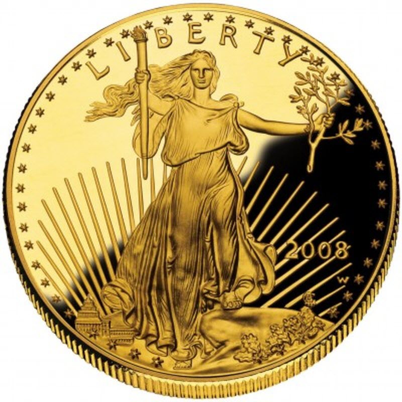 Эта золотая инвестиционная монета была впервые отчеканена в 1986 году. Ее проба равна 22 каратам (916,7 частей золота), содержание чистого золота в монете составляет 1 тройскую унцию (31,1 грамма), а сама монета весит почти 34 грамма. По закону золото для изготовления Американского орла должно быть добыто в США. В составе сплава монеты содержится серебро и медь для придания монете прочности и долговечности.