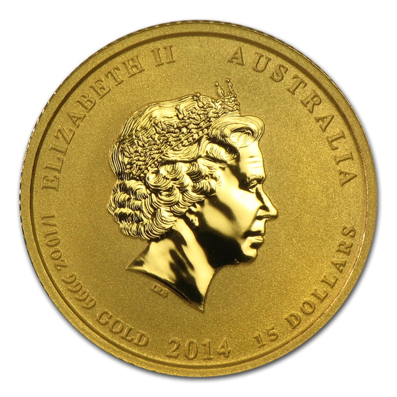 На аверсе изображен портрет Королевы Елизаветы ІІ. Над портретом размещается текст "ELIZABETH II" - Елизавета ІІ, "AUSTRALIA" - Австралия. Ниже портрета напечатаны номинал монеты - 15 долларов, год выпуска (2014), вес (1/10 унции), содержание чистого золота в монете (9999), а также инициалы художника "IRB" - Яна Рэнк-Бродли.