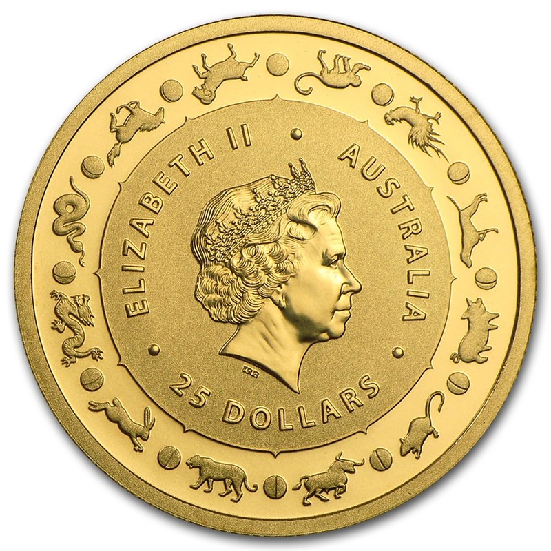 На аверсе изображен портрет Ее Величества королевы Елизаветы II, вокруг которого размещены следующие надписи: «ELIZABETH II AUSTRALIA 25 DOLLARS» (Елизавета II, Австралия, 25 австралийских долларов). По ободу кругом выгравированы образы 12 животных, символизирующие китайский зодиак и 12 фаз луны.