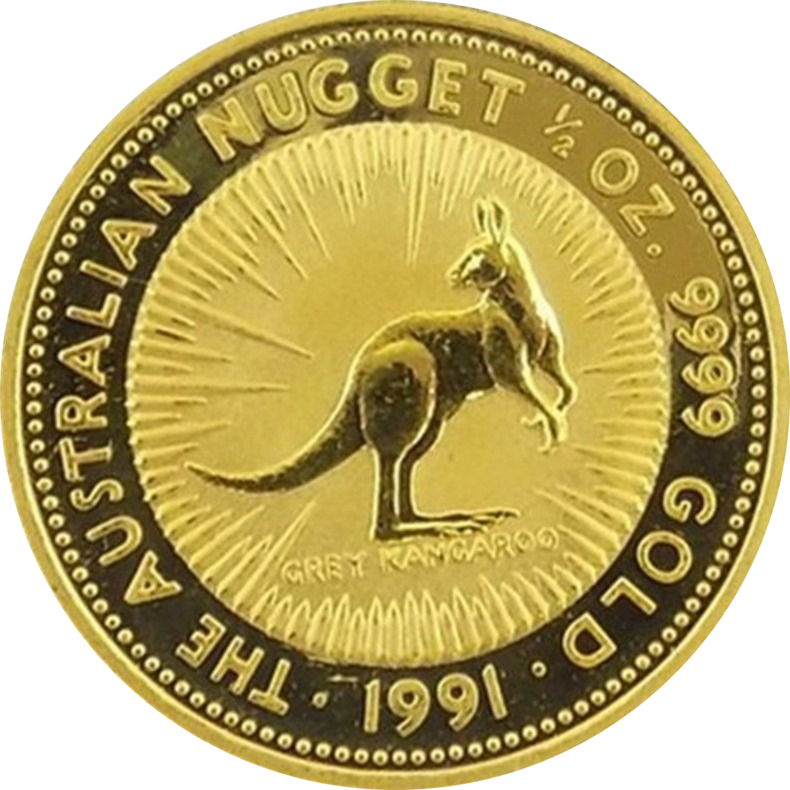 На реверсе изображен серый кенгуру, смотрящий назад. По краю монеты надписи: "австралийский наггет", "1/2 унции", "золото 9999", "1991".