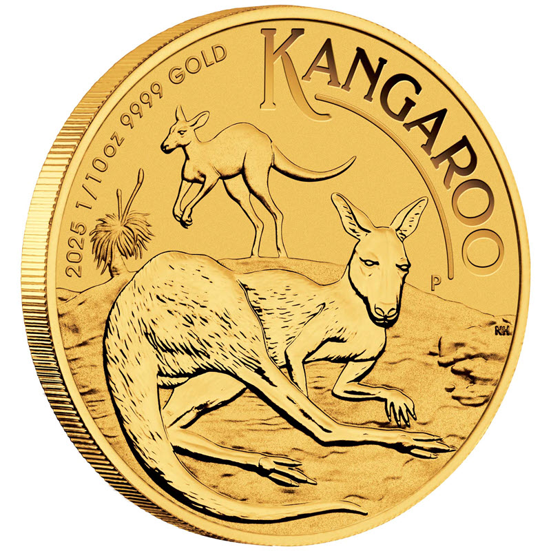На реверсе изображены два кенгуру. Один кенгуру лежит на боку, греясь на солнышке, другой готовится прыгнуть вперед. Слева вверху травянистое дерево (Xanthorrhoea australis). Правее лежащего кенгуру: Р (монограмма Пертского монетного двора), справа у канта инициалы дизайнера: NH (Neil Hollis). Вверху вдоль канта надпись: 2025 1/10oz 9999 GOLD KANGAROO (год чеканки, вес и проба золота, кенгуру).
