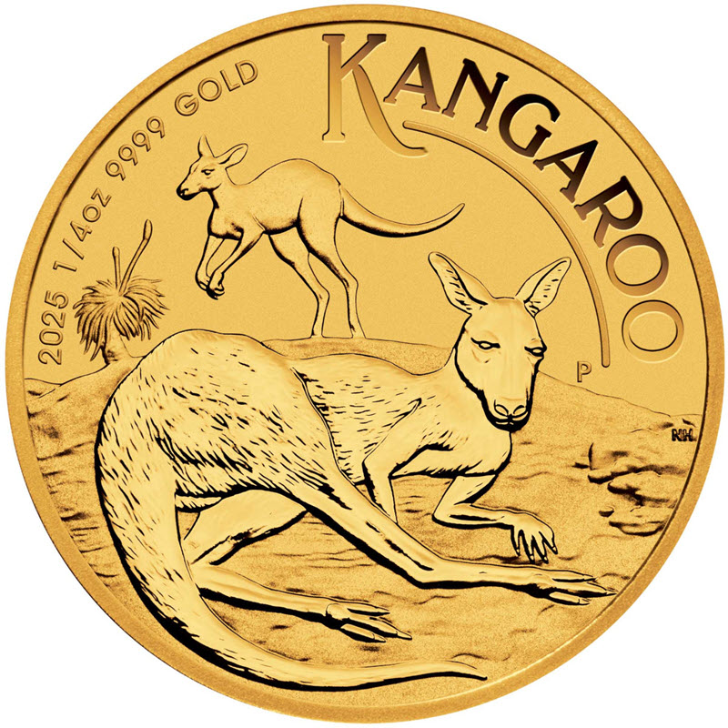 На реверсе изображены два кенгуру. Один кенгуру лежит на боку, греясь на солнышке, другой готовится прыгнуть вперед. Слева вверху травянистое дерево (Xanthorrhoea australis). Правее лежащего кенгуру: Р (монограмма Пертского монетного двора), справа у канта инициалы дизайнера: NH (Neil Hollis). Вверху вдоль канта надпись: 2025 1/4oz 9999 GOLD KANGAROO (год чеканки, вес и проба золота, кенгуру).