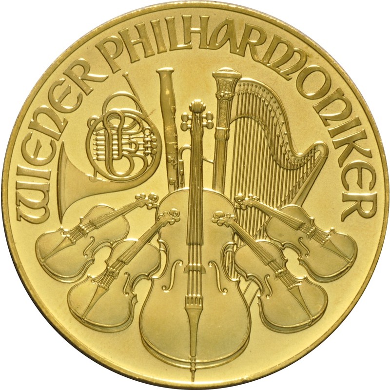 На реверсе золотой монеты австрийский Филармоникер изображены различные музыкальные инструменты, такие как контрабас, виолончели, скрипки, фагот, арфа и труба. Сверху надпись – WIENER PHILHARMONIKER.