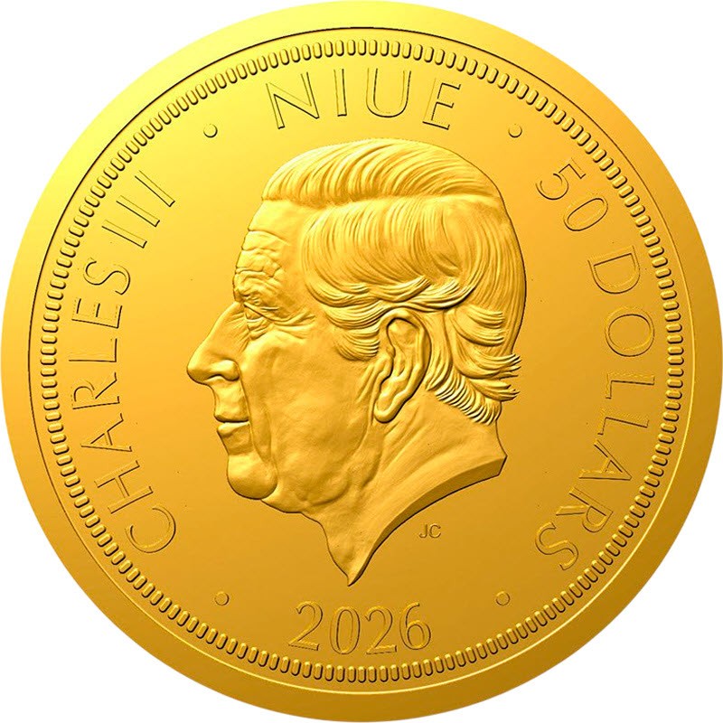 На аверсе изображен Его Величество король Чарльз III. На усечении шеи инициалы дизайнера JC (Jody Clark). Вдоль канта надпись: CHARLES III · NIUE · 50 DOLLARS · 2026 · (Чарльз III, страна-эмитент, номинал, год чеканки).