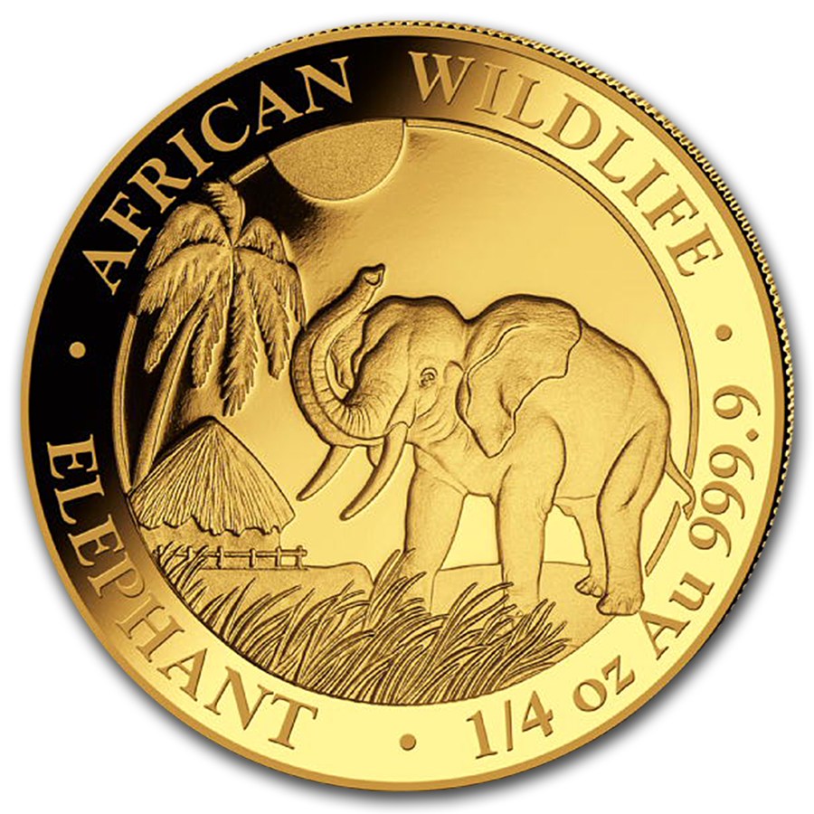 Золотая инвестиционная монета Сомали - Слон. Данная монета выпускается в рамках серии "Африканская дикая природа". Чеканка монеты производится на Баварском государственном монетном дворе. Изображение меняется ежегодно.