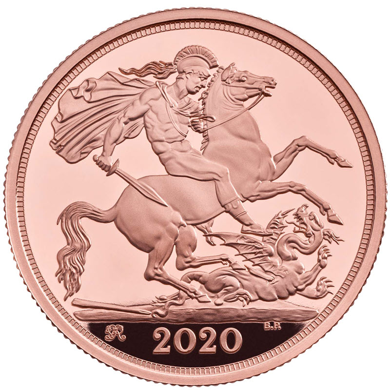 На реверсе классическое изображение Святого Георгия и дракона от Бенедетто Пиструччи. Внизу слева монограмма монетного двора Короля Георга III: GR, справа инициалы дизайнера: B.P. (Benedetto Pistrucci), ниже по центру: 2020 (год чеканки).