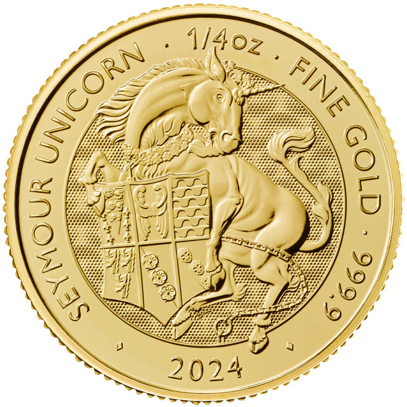 Вдоль канта надпись: SEYMOUR UNICORN · 1/4 oz · FINE GOLD · 999.9 ♦ 2024 ♦ (Единорог Сеймура, вес и проба золота, год чеканки).