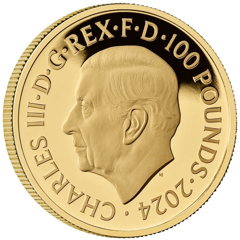 На аверсе изображен Его величество Король Чарльз III. Внизу портрета инициалы дизайнера MJ (Martin Jennings). Вдоль канта надпись: CHARLES III·D·G·REX·F·D·100 POUNDS·2024 · (Чарльз III, божьей милостью, король, защитник веры, номинал, год чеканки).