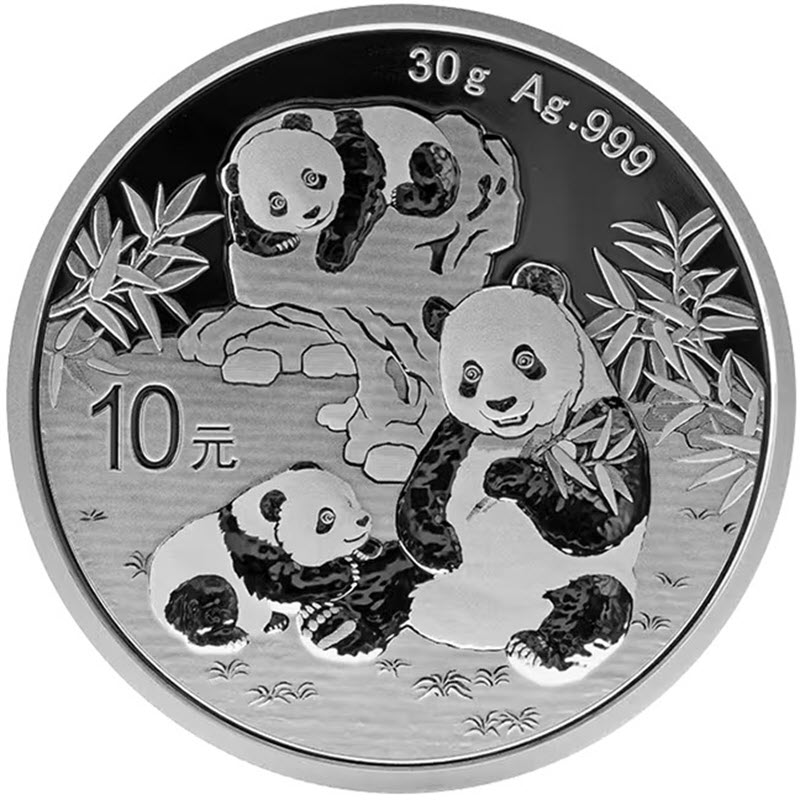 На реверсе изображены мать и два детеныша панды на фоне камней и листьев бамбука. Вверху надпись: 30g Ag.999 (вес и проба серебра), слева: 10 元 (номинал).