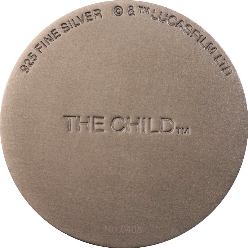 На аверсе вверху вдоль канта надпись: 925 FINE SILVER © & ™Lucasfilm LTD (проба серебра, авторские права), в центре: THE CHILD™ XXX (Малыш, индивидуальный номер миниатюры).