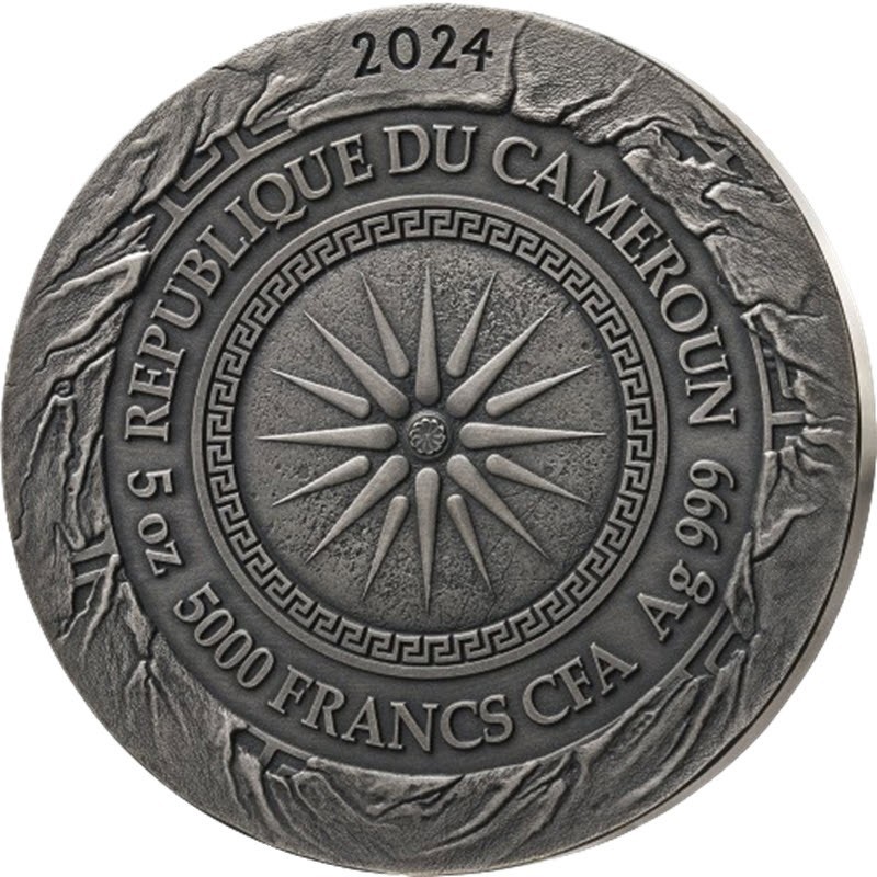 На аверсе изображен щит. Вверху надпись: 2024 (год чеканки). Вокруг щита надпись: REPUBLIQUE DU CAMEROUN 5 oz 5000 FRANCS CFA Ag 999 (страна-эмитент, вес и проба серебра, номинал).