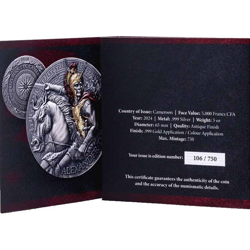 Серебряная монета Камеруна "Великие полководцы. Александр Великий" 2024 г.в., 155.5 г чистого серебра (проба 999)
