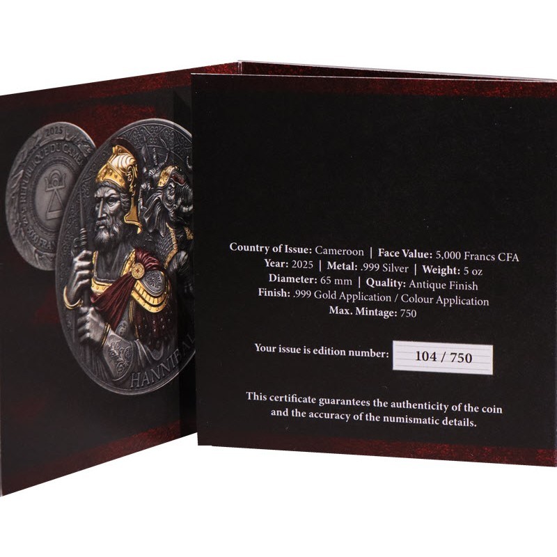 Эта удивительная серебряная монета весом в 5 унций – третья из серии «Великие полководцы» - посвящена Ганнибалу. У нее качество античной отделки, высокий рельеф, выборочное золочение и селективная окраска. Поставляется в оригинальном футляре с сертификатом подлинности. Тираж: 750 штук.