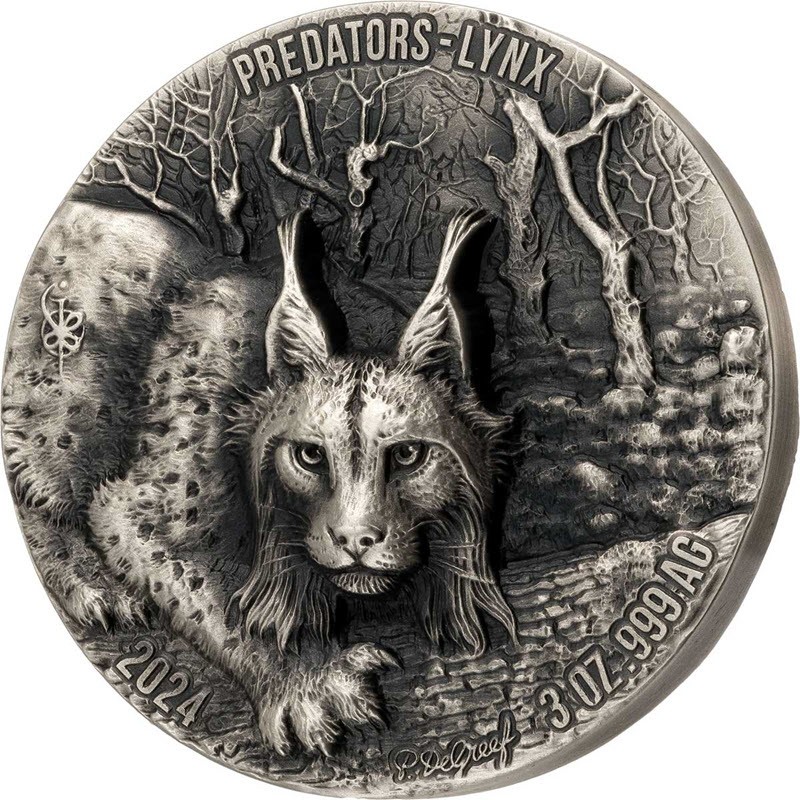 На реверсе изображена рысь на охоте в зимнем лесу. Вдоль канта надпись: PREDATOR-LYNX 2024 P.DeGreef 3 OZ .999 AG (хищник-рысь, год чеканки, монограмма П. де Грефа, вес и проба серебра).