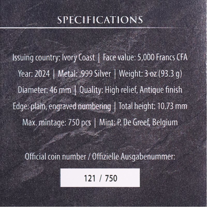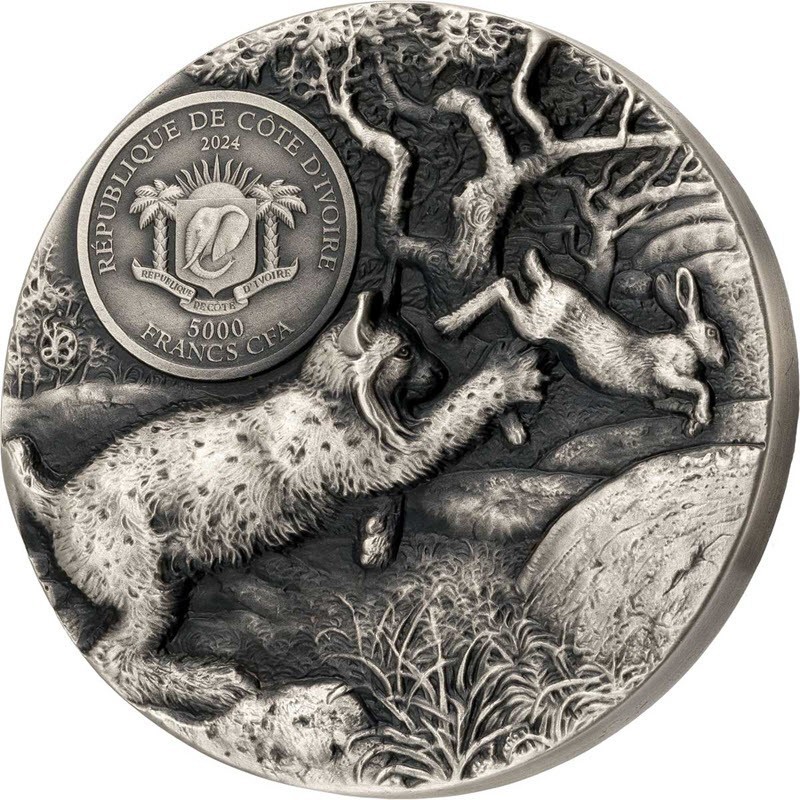 На аверсе слева вверху изображен герб Кот-д’Ивуара на фоне охоты рыси. Вокруг герба надпись: RÉPUBLIQUE DE CÔTE D'IVOIRE (страна-эмитент), под ней: 2024 (год чеканки). Внизу надпись в две строки: 5000 FRANCS CFA (номинал). На гурте выгравирован индивидуальный номер монеты.