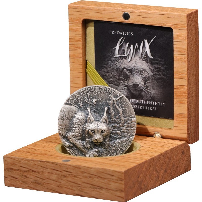 Эта серебряная монета из серии «Хищники» посвящена рыси. Дизайн был реализован медальерами студии П. Де Грефа (на реверсе монограмма студии) на высочайшем уровне, даже такие тонкости, как шерсть, впечатляюще смотрятся. Индивидуальная нумерация на гурте. У нее высокий рельеф и античная отделка. Поставляется в деревянном футляре с сертификатом подлинности. Тираж: 750 штук.
