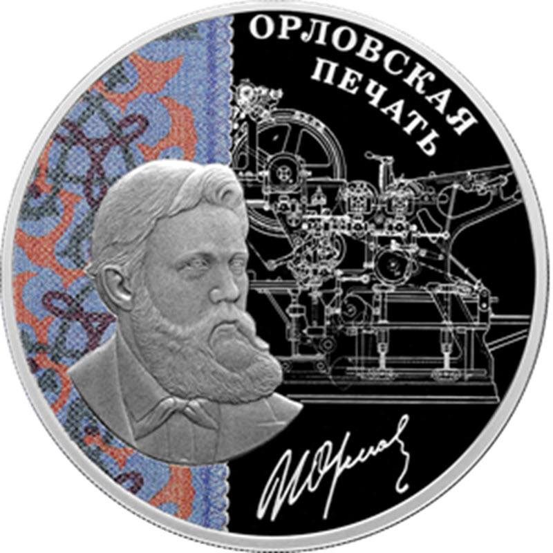 На реверсе изображен портрет И.И. Орлова на фоне чертежа печатного станка и цветного орнаментального покрытия. Вверху надпись: ОРЛОВСКАЯ ПЕЧАТЬ, внизу: факсимиле подписи И.И. Орлова.