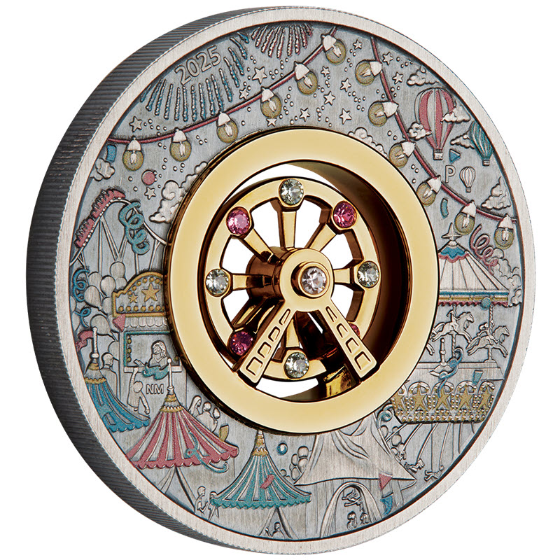 Эта чудесная серебряная монета весом в 2 унции посвящена культовому колесу обозрения. У нее прекрасный дизайн и качество античной отделки, выборочное золочение и вставки кристаллов Swarovski. Встроенное в монету миниатюрное колесо обозрения вращается. Поставляется в оригинальном футляре с сертификатом. Тираж: 2000 штук.