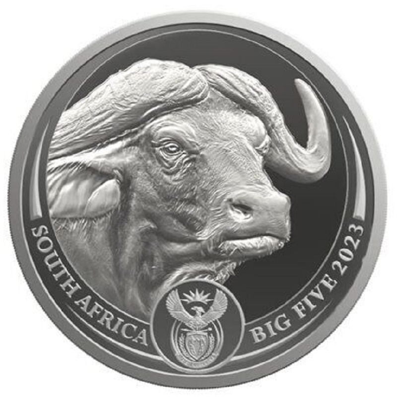 На реверсе монеты изображено красивое и детальное изображение головы буйвола. На оборотной стороне монеты надписи: "SOUTH AFRICA" - страна-эмитент, "BIG FIVE" - название серии и "2023" - год выпуска и национальный герб ЮАР.