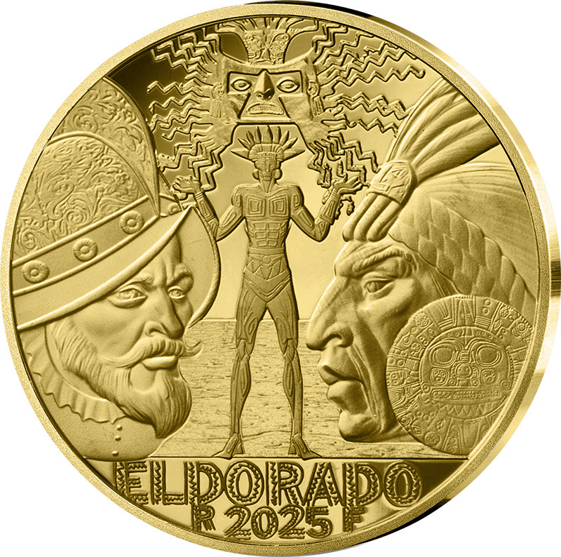 На реверсе изображены испанский конкистадор и Атауальпа, последний император инков. В центре монеты над мифическим озером возвышается золотой идол инков «ЭЛЬДОРАДО». Внизу надпись: ELDORADO R 2025 F (Эльдорадо, Франция, год чеканки).