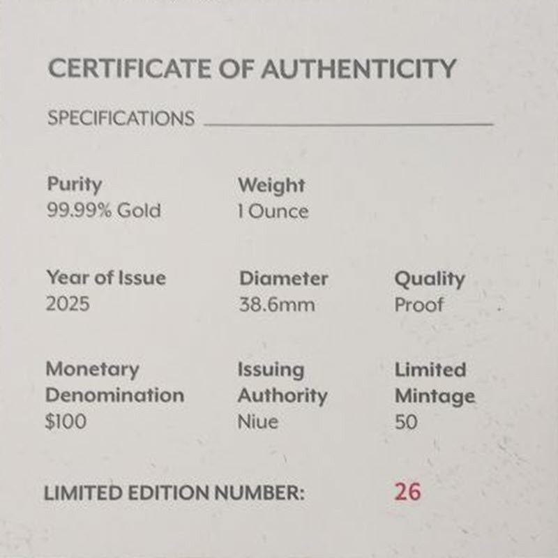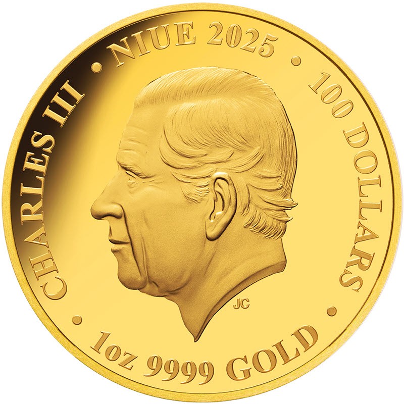 На аверсе изображен Его Величество король Чарльз III. На усечении шеи инициалы дизайнера Джоди Кларк (JC, Jody Clark). Вдоль канта надпись: CHARLES III · NIUE 2025 · 100 DOLLARS · 1oz 9999 GOLD · (Чарльз III, страна-эмитент, год чеканки, номинал, вес и проба золота).