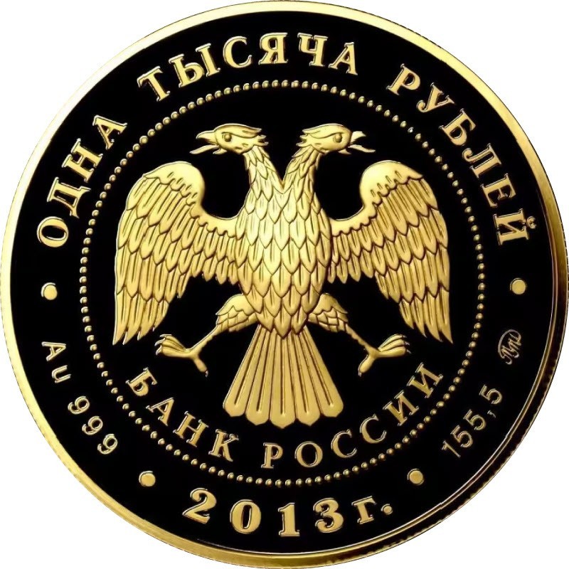 В центре - эмблема Банка России (двуглавый орёл с опущенными крыльями, под ним - надпись полукругом "БАНК РОССИИ"), обрамленная кругом из точек и надписями по кругу - вверху: "ОДНА ТЫСЯЧА РУБЛЕЙ", внизу: слева - обозначения драгоценного металла и пробы сплава, в центре - дата выпуска "2013 г.", справа - содержание химически чистого металла и товарный знак монетного двора.
