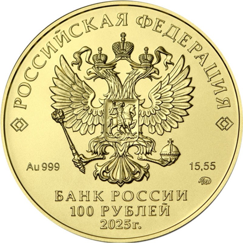 На аверсе в центре — рельефное изображение Государственного герба Российской Федерации, вверху вдоль канта надпись: РОССИЙСКАЯ ФЕДЕРАЦИЯ, обрамленная с обеих сторон сдвоенными ромбами, под гербом надпись: Au 999 15,55 ..МД (вес и проба золота, монограмма монетного двора), внизу надпись в три строки: БАНК РОССИИ 100 РУБЛЕЙ ХХХ г. (банк, номинал, год чеканки).