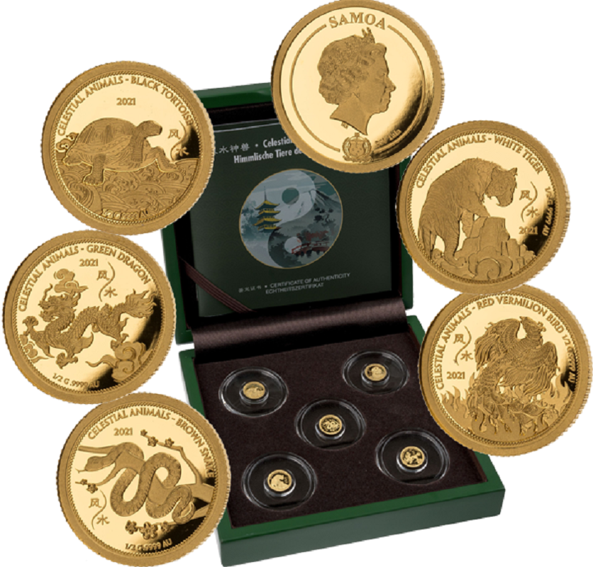 Этот набор посвящен традиционной китайской дисциплине — фен-шуй и представлен пятью золотыми монетами высочайшего качества. Тираж всего 888 монет по всему миру.