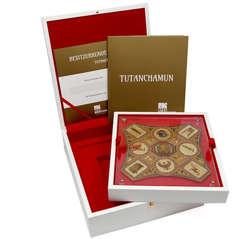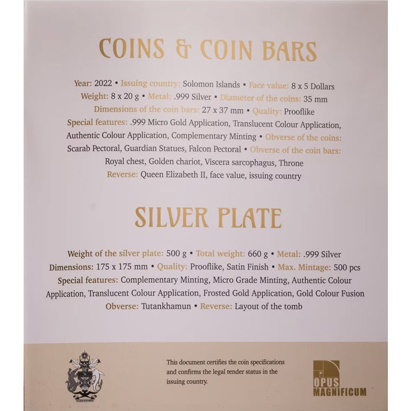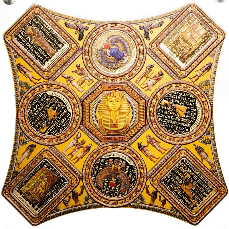 На реверсе каждой серебряной монеты изображен артефакт, найденный в гробнице самого молодого фараона египетской империи — он умер всего в 18 лет! Открытие было сделано археологом Говардом Картером 29 ноября 1922 года в Долине царей, недалеко от города Луксор на юге Египта. Каждая монета имеет специальные функции: дополнительная чеканка, чеканка микрокласса, нанесение аутентичного цвета, нанесение полупрозрачного цвета, нанесение микрозолота 999 пробы и нанесение матового золота.