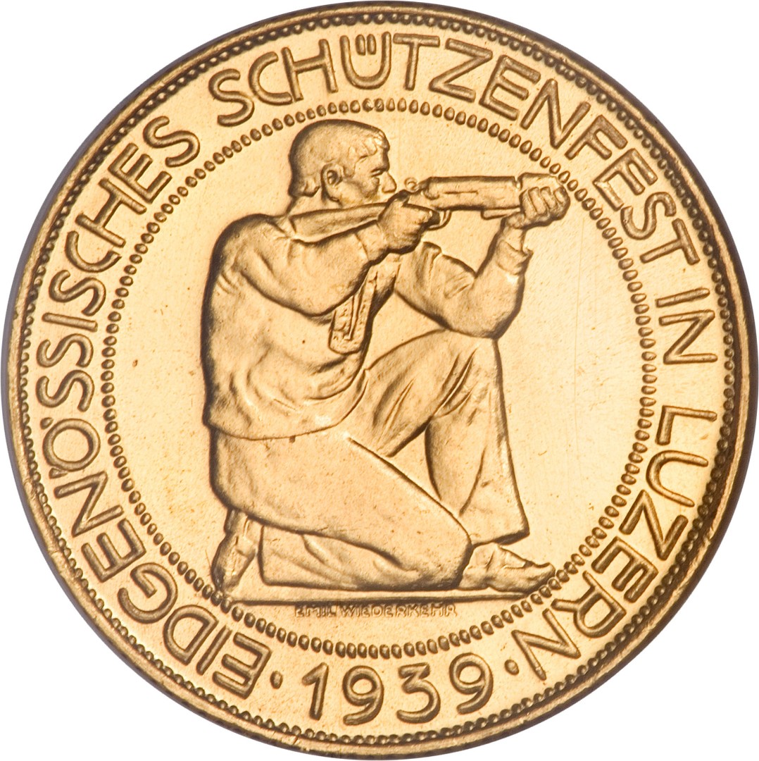 Золотая монета Швейцарии "Люцернский стрелковый фестиваль" 1939 г.в., 15.75 г чистого золота (Проба 0,900)