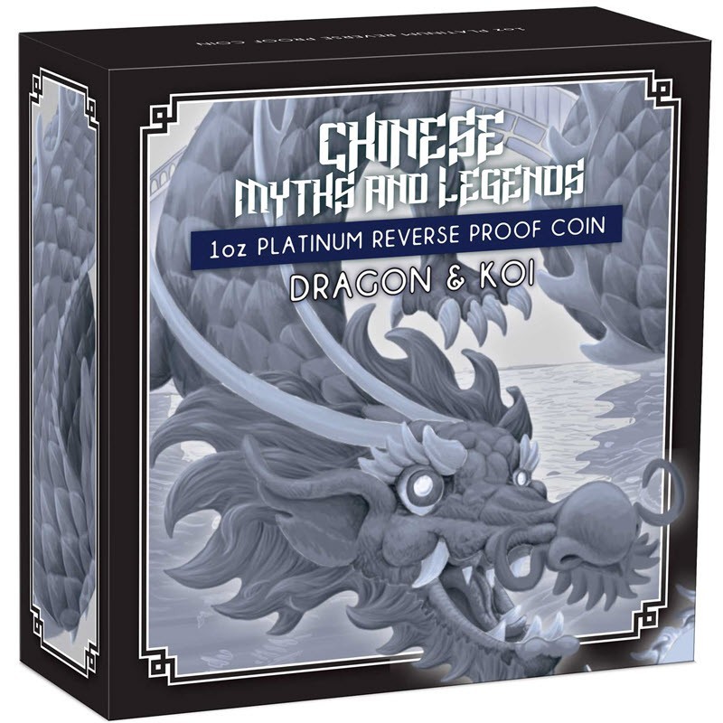 Платиновая монета из серии "Китайские мифы и легенды" от Пертского монетного двора Австралии весом в 1 тройскую унцию посвящена Дракону и Кои. У нее качество пруф-реверс. Поставляется в оригинальном футляре с сертификатом подлинности. Тираж: 150 штук.