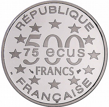 На реверсе помещены следующие надписи: страна-эмитент (RÉPUBLIQUE-FRANÇAISE) и номинал (500 FRANCS // 75 ECUS). Надписи окружены двенадцатью звездами, символизирующими Европу.