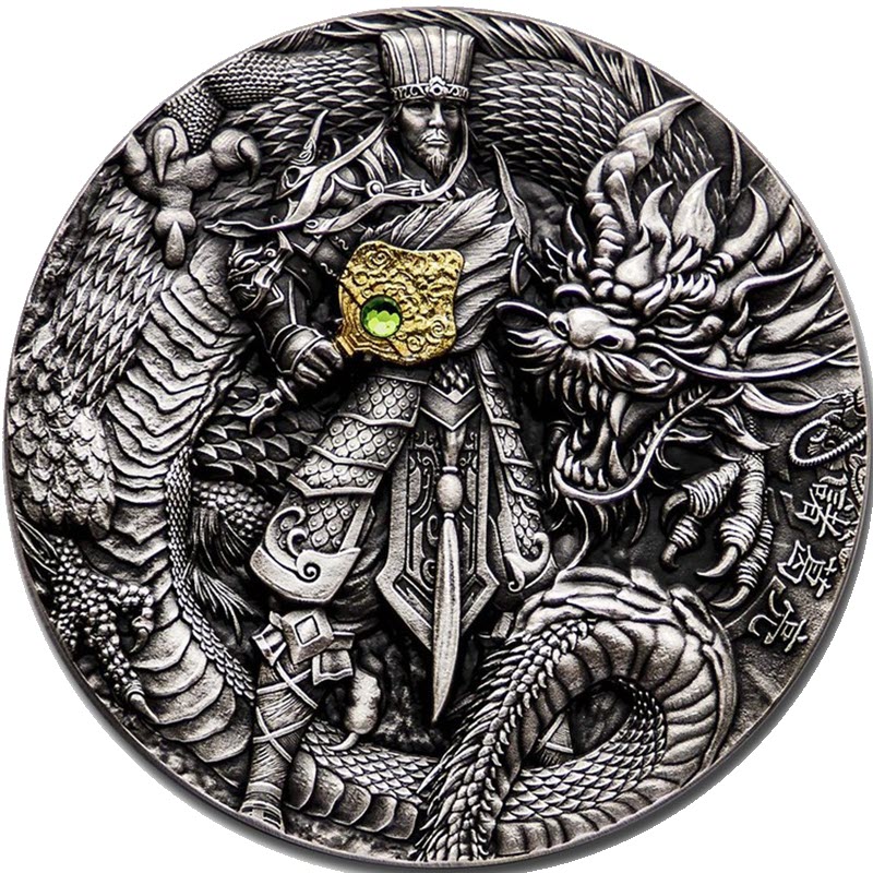 Восхитительная серебряная монета с рельефной, очень детализированной чеканкой Чжуге Ляна, великого древнекитайского полководца и государственного деятеля эпохи Троецарствия. Он принимал участие в боевых походах и являлся родоначальником воссоединения империи Хань и династии Лю. Монета поставляется в футляре с сертификатом подлинности. Тираж — 555 штук.