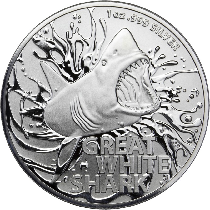 На реверсе монеты изображена большая белая акула с широко раскрытой пастью, выпрыгивающая из воды. Вверху надпись: 1oz Ag .999 (проба и вес серебра). Внизу: GREAT WHITE SHARK (Большая белая акула).
