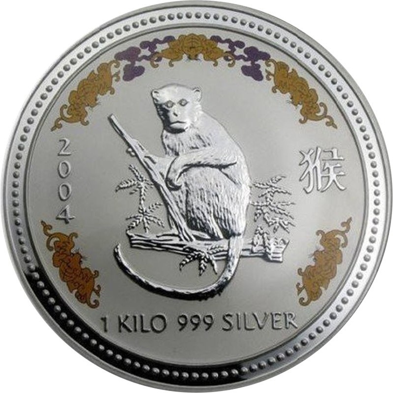 На реверсе изображен символ 2004 года – Обезьяна на ветке. Справа иероглиф: 猴(Обезьяна), слева: 2004 (год чеканки). Внизу надпись: 1 KILO 999 SILVER (вес и проба серебра).