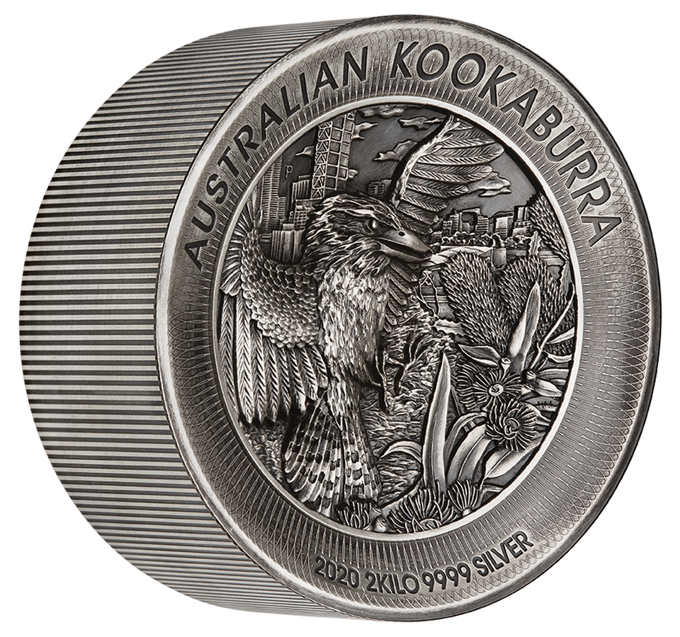 Серебряная монета весом 2 килограмма, выполненная в античном стиле, чтобы передать глубину деталей в реверсном дизайне, на котором изображена летающая кукабарра над парком Перт Кингс. Ограниченный тираж.