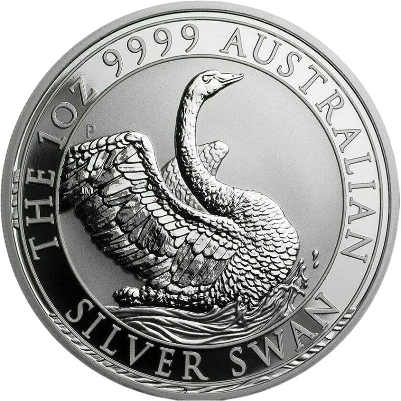 На реверсе монеты изображение лебедя дизайнера Дженнифер МакКенна (JМ), приземляющегося на воду с распростертыми крыльями. Слева около крыла монограмма Пертского монетного двора — P. Вверху вдоль канта надписи: THE 1OZ 9999 AUSTRALIAN SILVER SWAN (вес и проба серебра, серия).