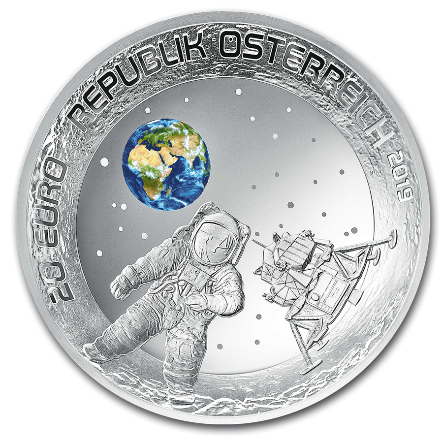 Серебряная монета Австрии "50 лет высадке человека на Луну" 2019 г.в., 20.74 г чистого серебра (Проба 0,925)