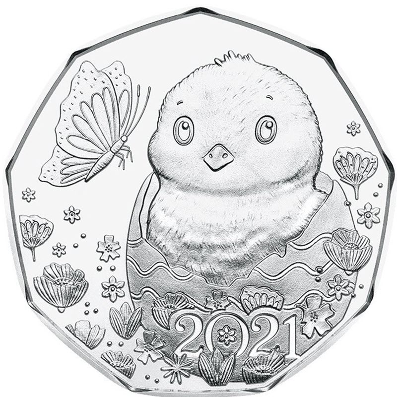 Традиционная ежегодная пасхальная монета от Монетного двора Австрии, в 2021 году представлена пасхальным цыпленком. Цыпленок встречает весну, а весна встречает Пасху. Птенец, вылупившийся из яйца, символизирует воскрешение жизни.