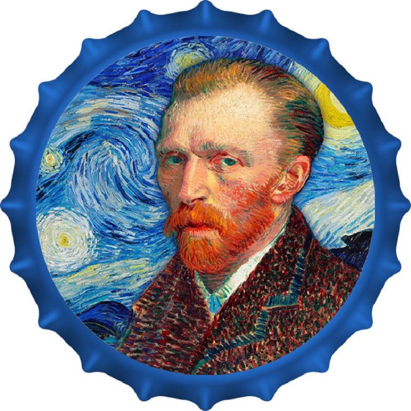 Серебряная монета в форме крышки от бутылки с портретом художника и одного из известных его произведений. Качество «PROOF», поставляется в тематическом футляре с сертификатом подлинности.